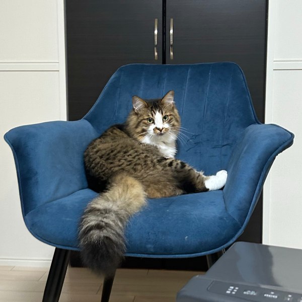 飼い主さんに話を聞くと「ふとくつろいでいるほたてを見たら、こんな格好をしていたので撮影しました」とのこと。その姿は、まるで社長椅子にふんぞり返るボスのよう。ボウルのフチに肘をつき、しっぽを優雅にたらしたポーズには、堂々たる貫禄が漂っています。