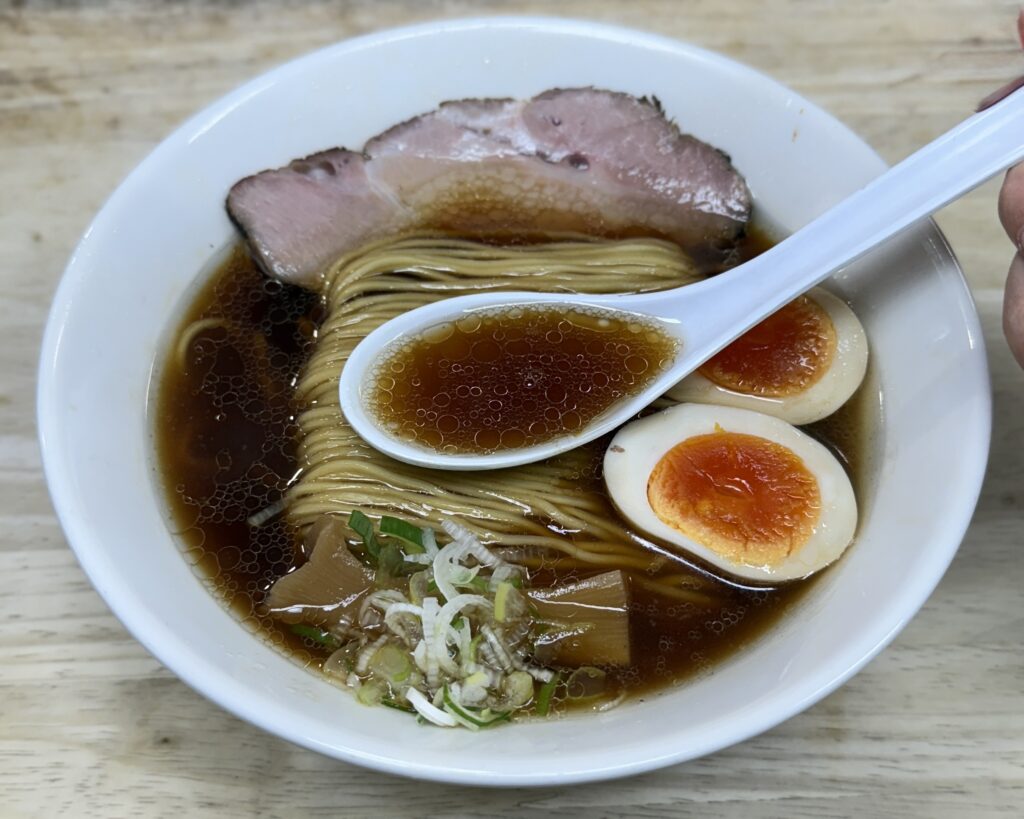 スープは濃い茶色で、表面には油膜が張り、つやつやと輝いています。麺を持ち上げると、その油膜が麺にまとわり、輝きを放ちます。