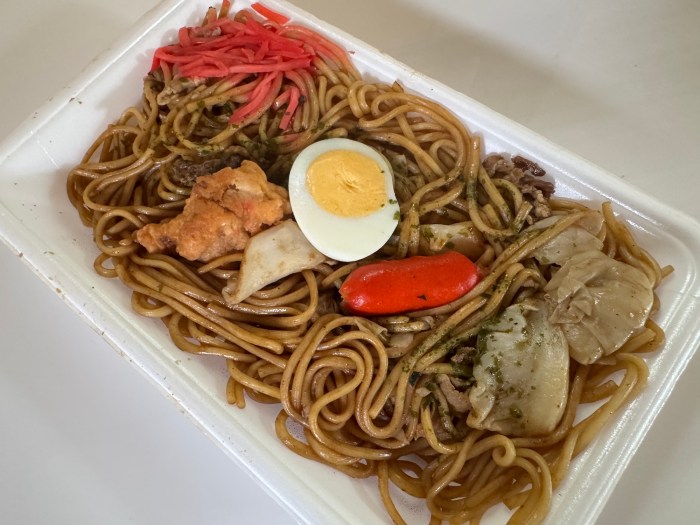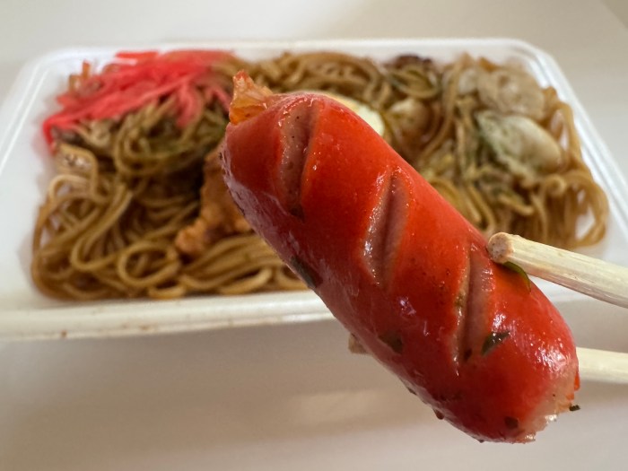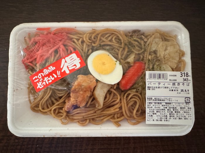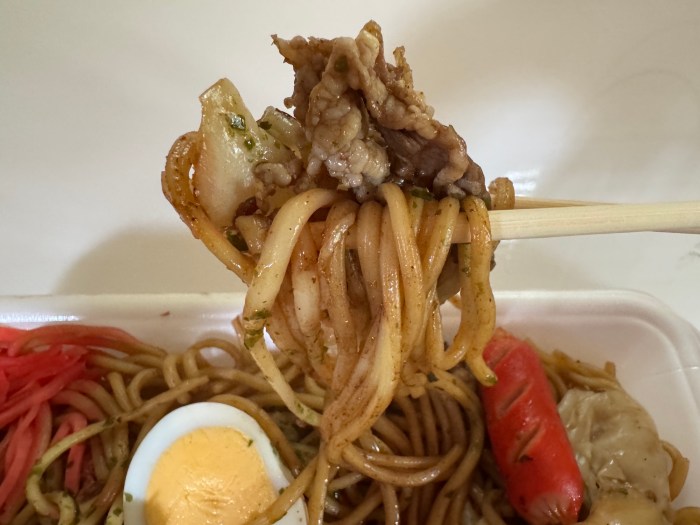 唐揚げは「ザ・弁当の唐揚げ」といった感じの、薬にも毒にもならない味。とはいえ、ゆで卵・唐揚げ・赤ウインナーが加わることで、焼きそばは「ただの焼きそば」から「どちらかといえば弁当」へ、明らかに変化した。