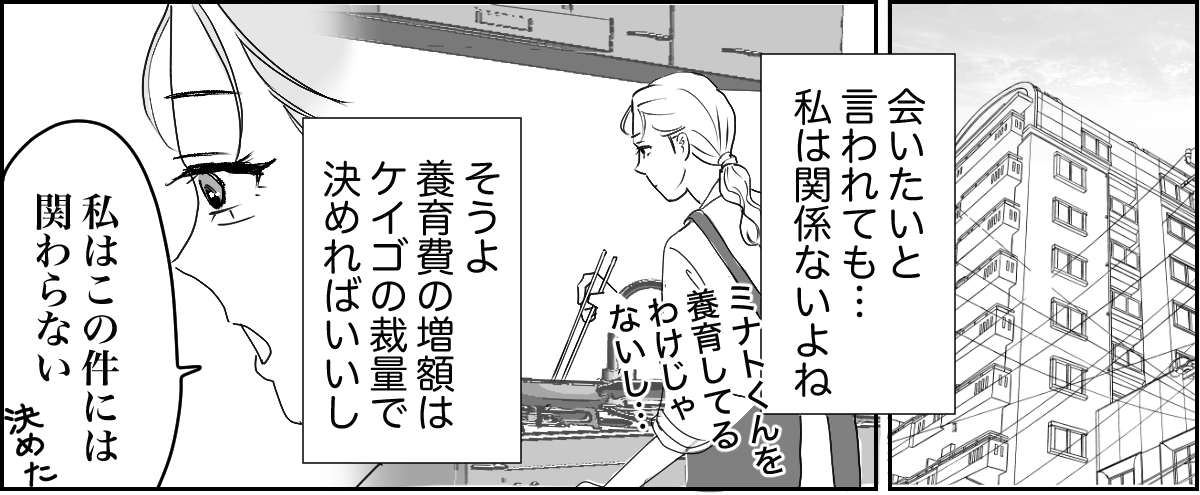 今後ケイゴと養育費のことを決めるときは、大人としてきちんと礼儀をもって話し合いたいです。それと……ミナトとケイゴをずっと会わせていなかった件ですが、以前からずっと両親には「ミナトが希望するなら定期的に交流をもつべきだ」と言われ続けていました。