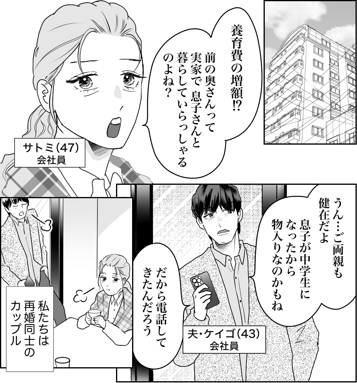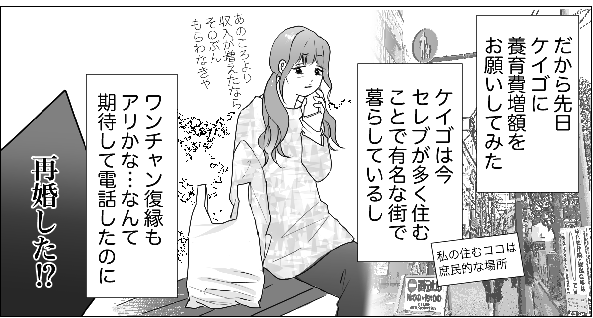 今ケイゴが住んでいる場所はすごくいい場所。電話で「今住んでいるのは〇〇駅前のマンションだ」と聞いたときには、胸が高鳴りました。それなのに、ケイゴは再婚していたのです。新しい奥さんはどんな人? 若い? 美人? 普通の人? いっそのこと復縁もアリかな……なんて期待していたのに……!