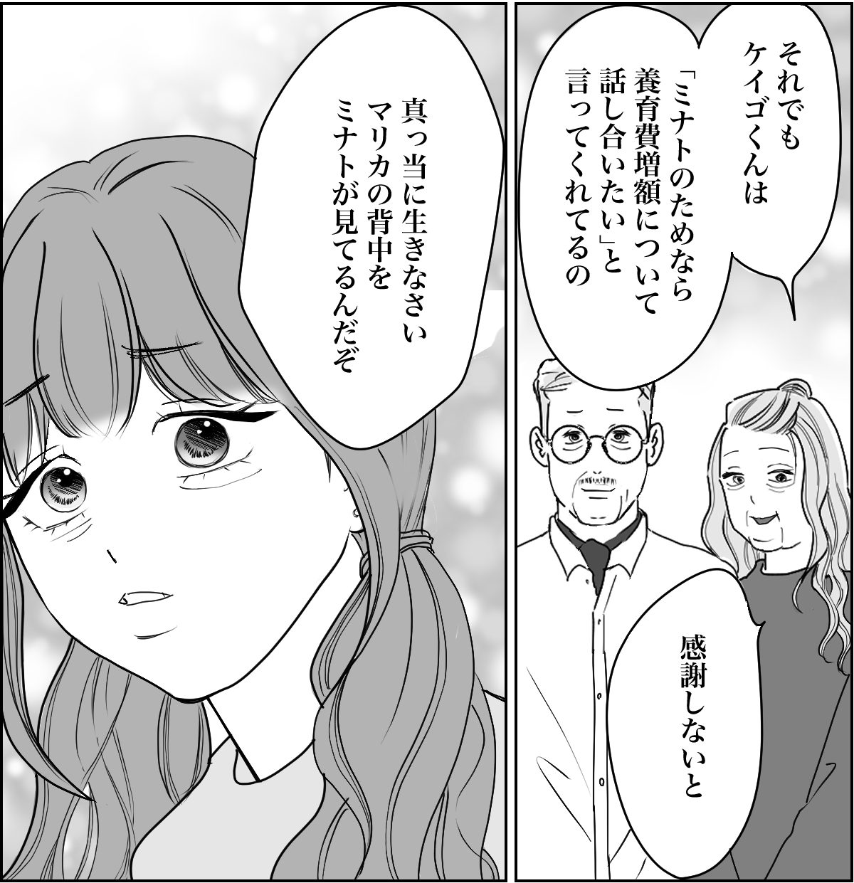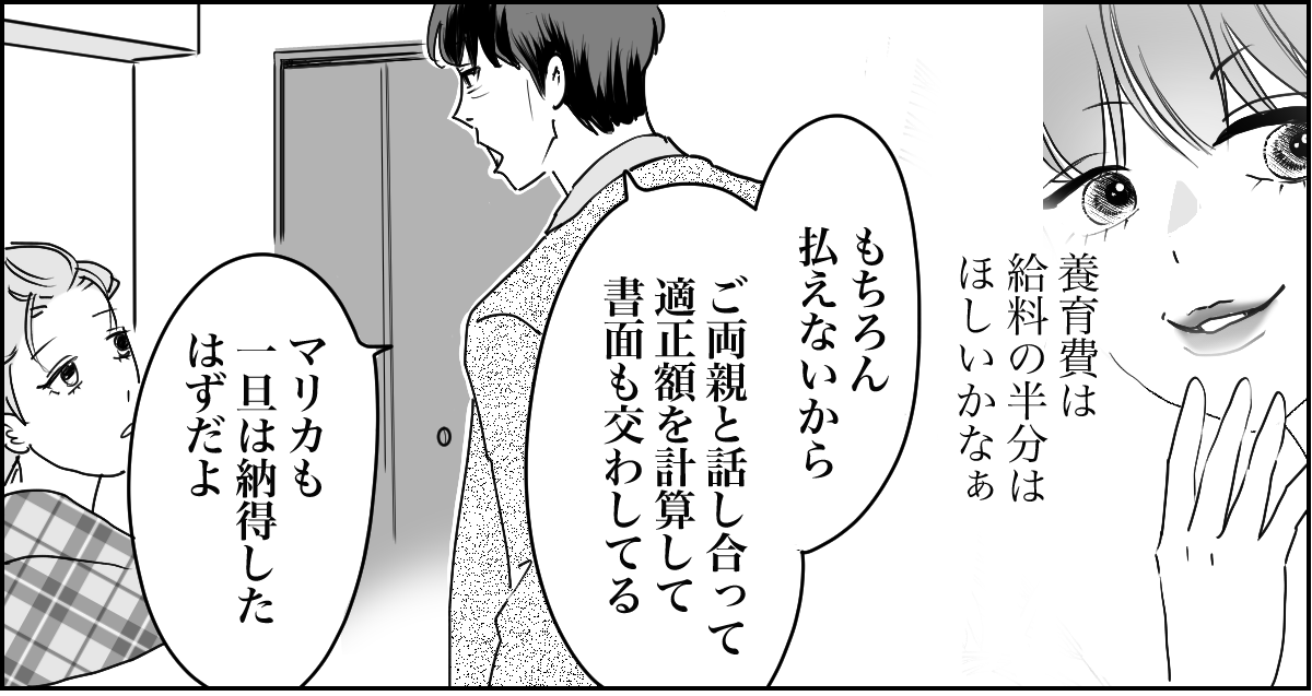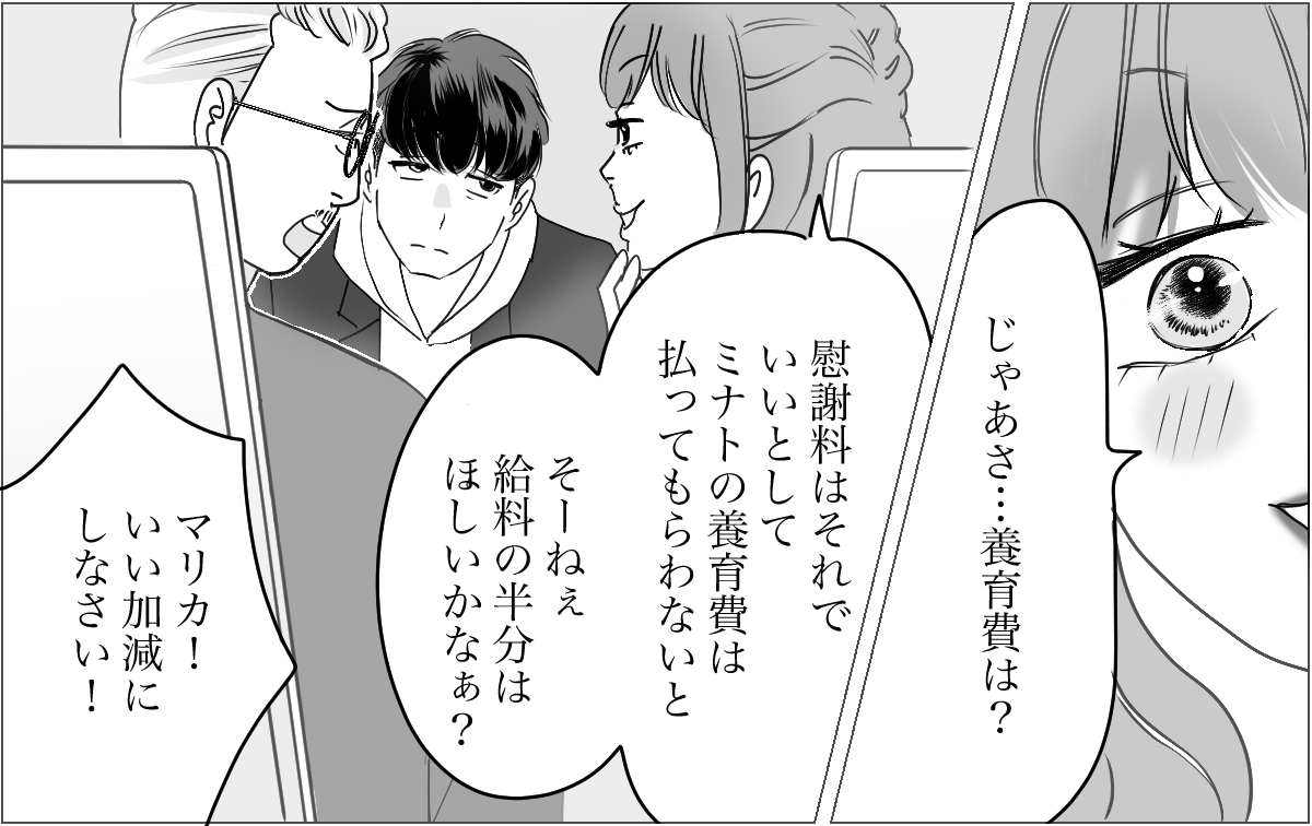 養育費の増額については、ケイゴが自由にできるお金の範囲だったら好きにしてもらって構いません。ケイゴとマリカさんの子どもの養育費なのだから、2人で話し合って決めればいい。私から話すことも、決めることも何もありません。