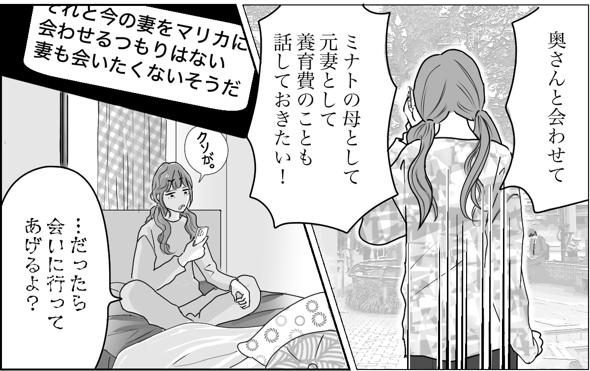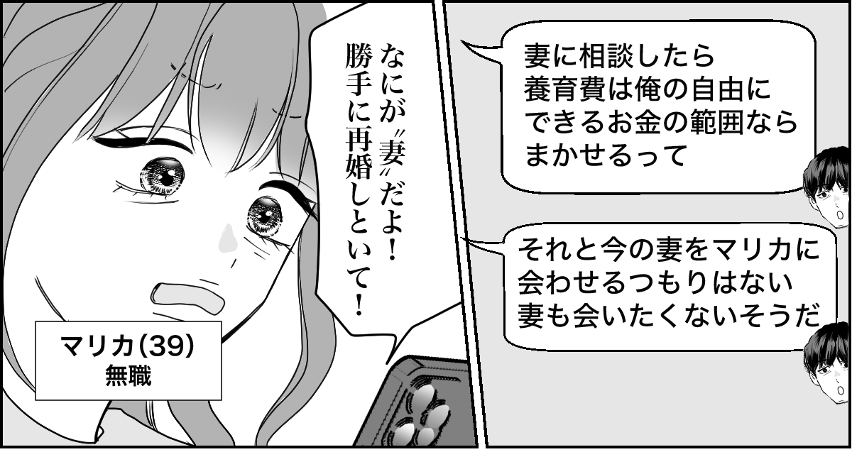 これは数年前の話です。私の名前はマリカ。アラフォーのバツイチシングルです。元夫のケイゴとは10年前に離婚しました。原因は……私の浮気です。当時3歳だった息子ミナトは私が引きとり、今は実家の両親と一緒に暮らしています。離婚するとき、ケイゴは私の両親と養育費の金額を勝手に決めてしまったのですが、正直私は今でも納得していません。だから10年間ミナトにも会わせていません。そして最近生活が厳しくて、養育費をもっとほしいと連絡しました。ミナトのためにまた一緒に暮らさないか、とも……すると、なんとケイゴは最近再婚したというじゃないですか!