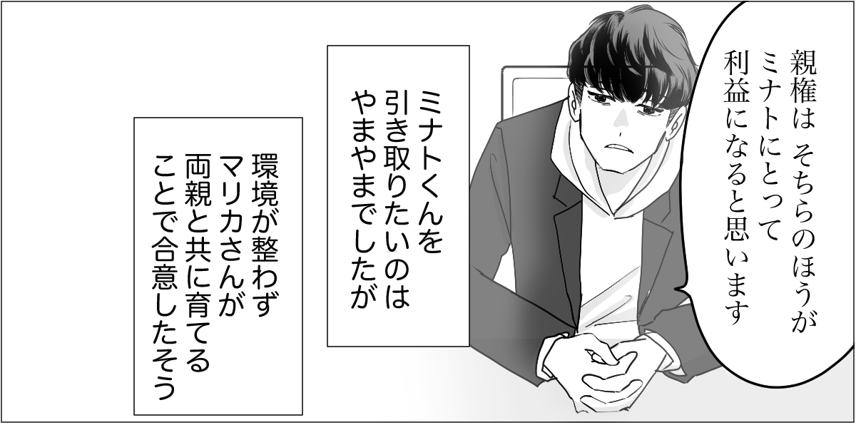 ケイゴがミナトくんを引き取りたかったのですが、環境が整わずマリカさんが引き取ることになりました。