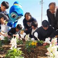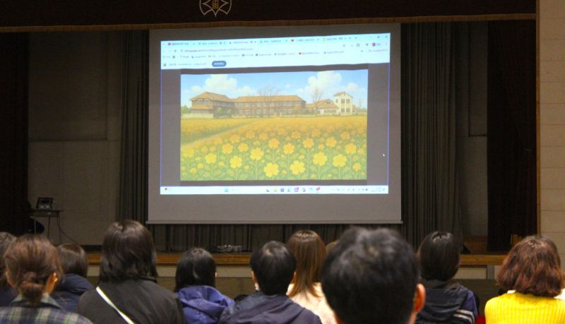 体育館では、子どもたちによる映像や写真を使った発表があり、昔の浜田小学校のことも紹介した。スクリーンには菜の花を描いた学校の絵も。60余年前に卒業したOBは、学校の周りで菜の花が一面に咲き誇っていた風景の記憶があるという。今は住宅や会社が立ち並ぶ町の真ん中の学校だが、校歌の歌詞に菜の花が出てくる意味を、子どもたちは理解したという。