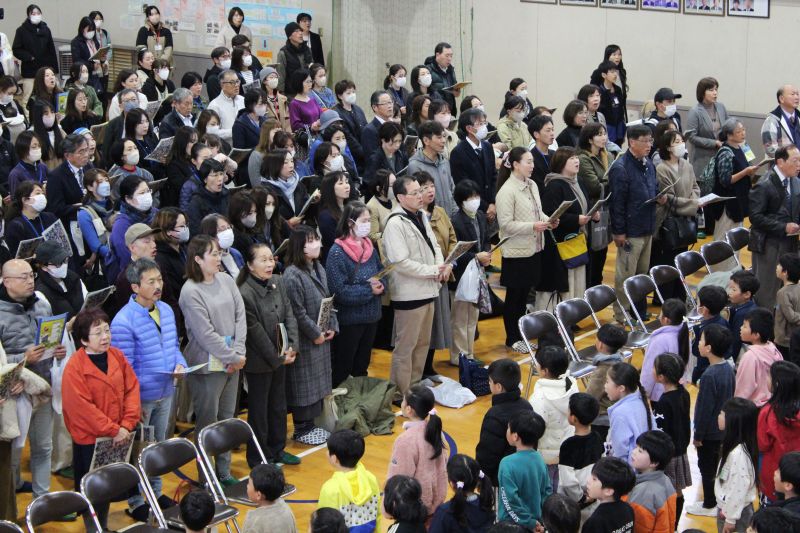 そして、いよいよ大合唱の時。児童たちと、参加した大人たちは、体育館の中で向き合って、ピアノ伴奏に合わせてうたった。当初は運動場でうたう計画だったが、雨が降ったための変更。室内になった分、歌声が響いて、迫力のあるひとときになった。