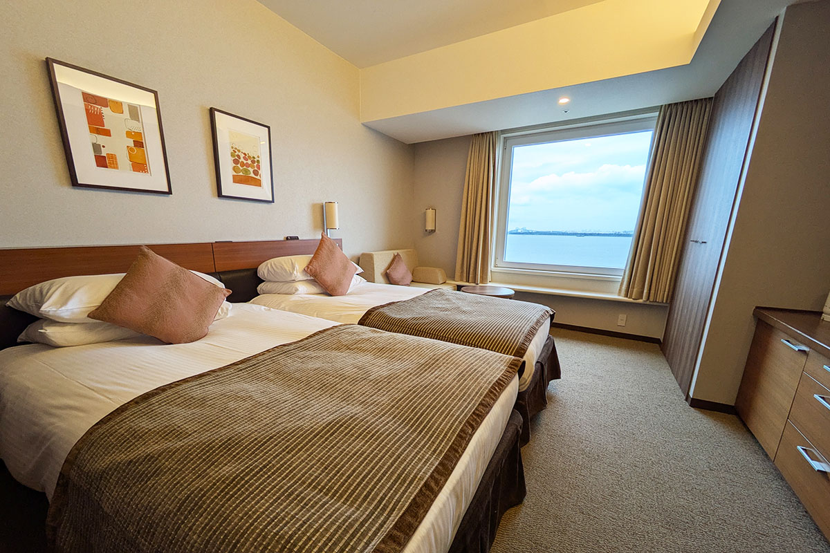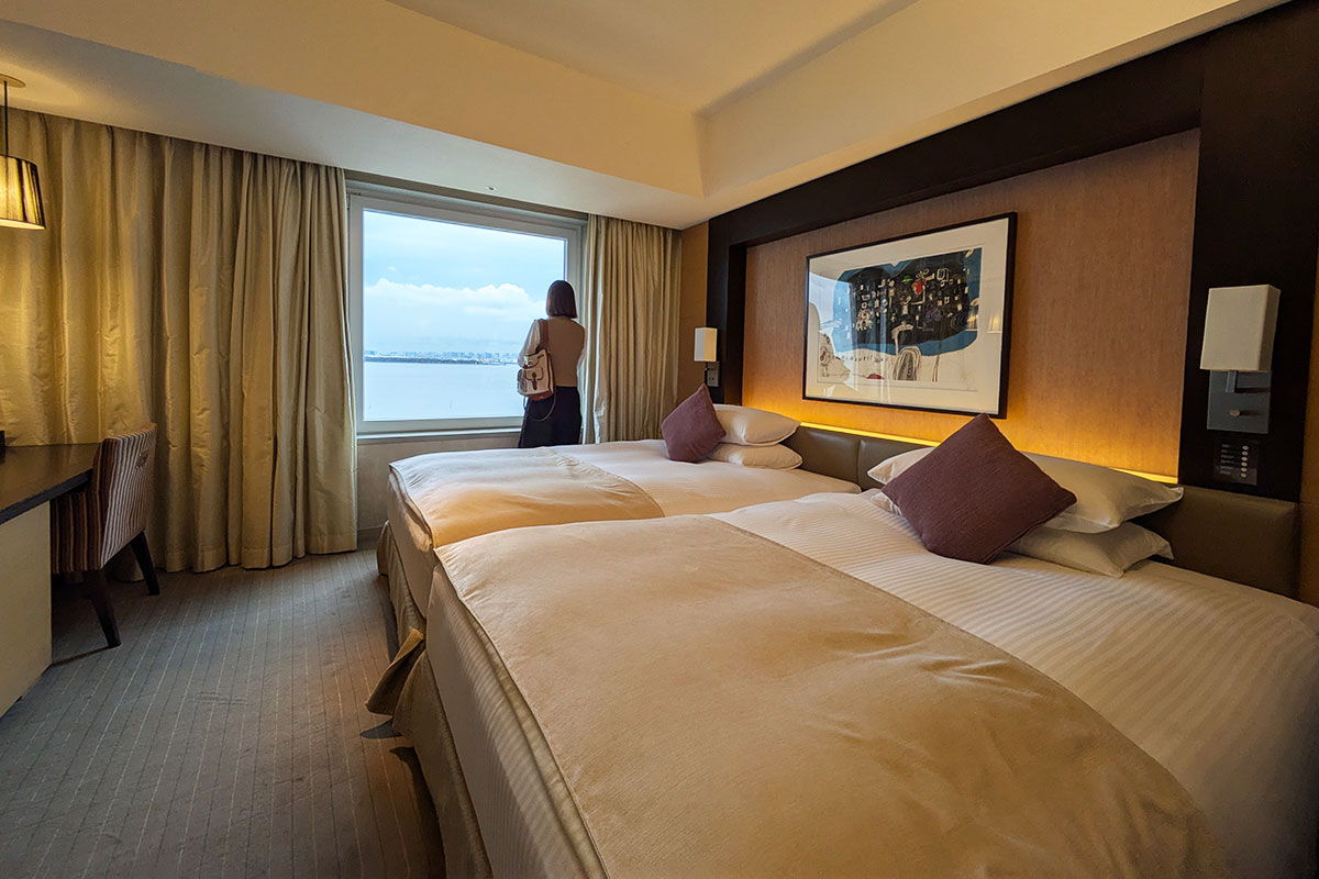 ハース・ハーモニールームはアースカラーで落ち着いた空間。広々としたお部屋にふかふかのベッドを備え、東京ベイを一望できる景色で一日の疲れを癒せます。さらに、最上階にあるベイビュー・スイートはリビングとベッドルームが分かれた64㎡の贅沢な空間! バスローブも付いており、優雅でゆったりとした時間を過ごせます。