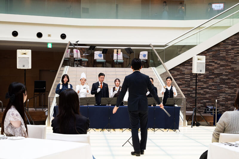 リブランドを記念して、この日は「舞浜ビューホテル by HULIC」のスタッフによるハンドベル演奏が行われました。忙しい業務の合間をぬって練習を重ねたと聞くと、スタッフのチームワークや仕事への誇りが感じられます。温かな音色が会場を包み込み、思わず笑顔になるひとときでした。続いて、プロの演奏家による弦楽四重奏が始まり、吹き抜けのアトリウム全体に優雅な旋律が響き渡ります。