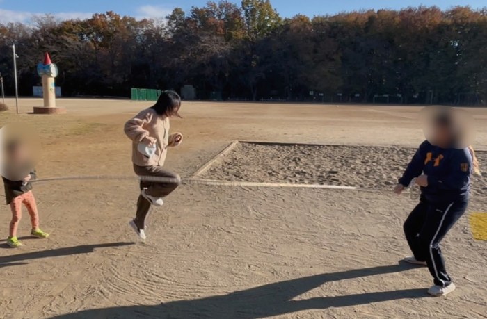 少し腹ごなしをしたところで、次は運動の“8”。家族でハマっている大縄の八の字跳び に挑戦した。