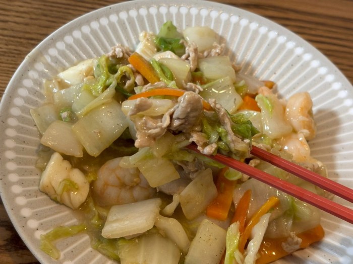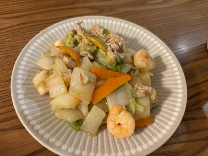 もともとの由来は「八つの宝のように具材が豊富」という意味らしいが、今回は細かいことは気にせず“だいたい八宝菜”として調理した。