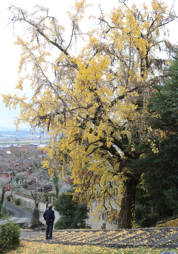 三重県伊賀市長田の射手神社には、高さ十数メートルのイチョウの大木がある。11月に入って黄に色付いた葉は、無数のギンナンとともに少しずつ舞い落ち、伊賀盆地を見渡せる石段を染めている。
