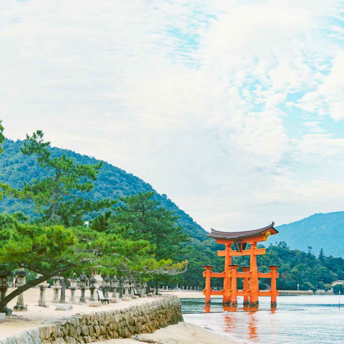 厳島神社社殿前面の海と背後の弥山原始林を含む森林地域が世界遺産として登録。海原にそびえる大鳥居と朱塗りの社殿群が織りなす神秘的な光景は日本を代表する絶景のひとつと言われている。