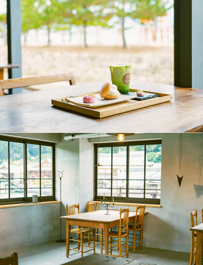 揚げもみじが名物の「紅葉堂」が手がける、ギャラリーを併設したカフェ・MAGOJiicafe&gallery 。参拝客でにぎわう通りから少し離れた御手洗川のほとりにあり、川のせせらぎに耳を傾けながらのんびり過ごすことができる。人気の和菓子セットには、地元の和菓子店や製餡所から仕入れたサクッと軽いもなかの皮とやわらかな粒あんを使用。香り豊かな抹茶ラテと一緒に、嚴島神社の大鳥居を望む窓際の特等席から世界遺産の景色を楽しもう。