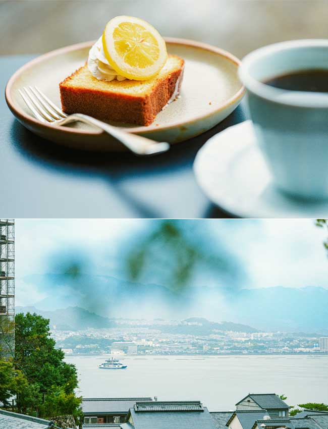 上/宮島の人気ロースタリーカフェ「伊都岐珈琲」の系列店。自家焙煎のドリップコーヒー110円、広島レモンケーキ660円。入場料別途要(550円、~5歳 330円) 下/本島の広島まで一望できる