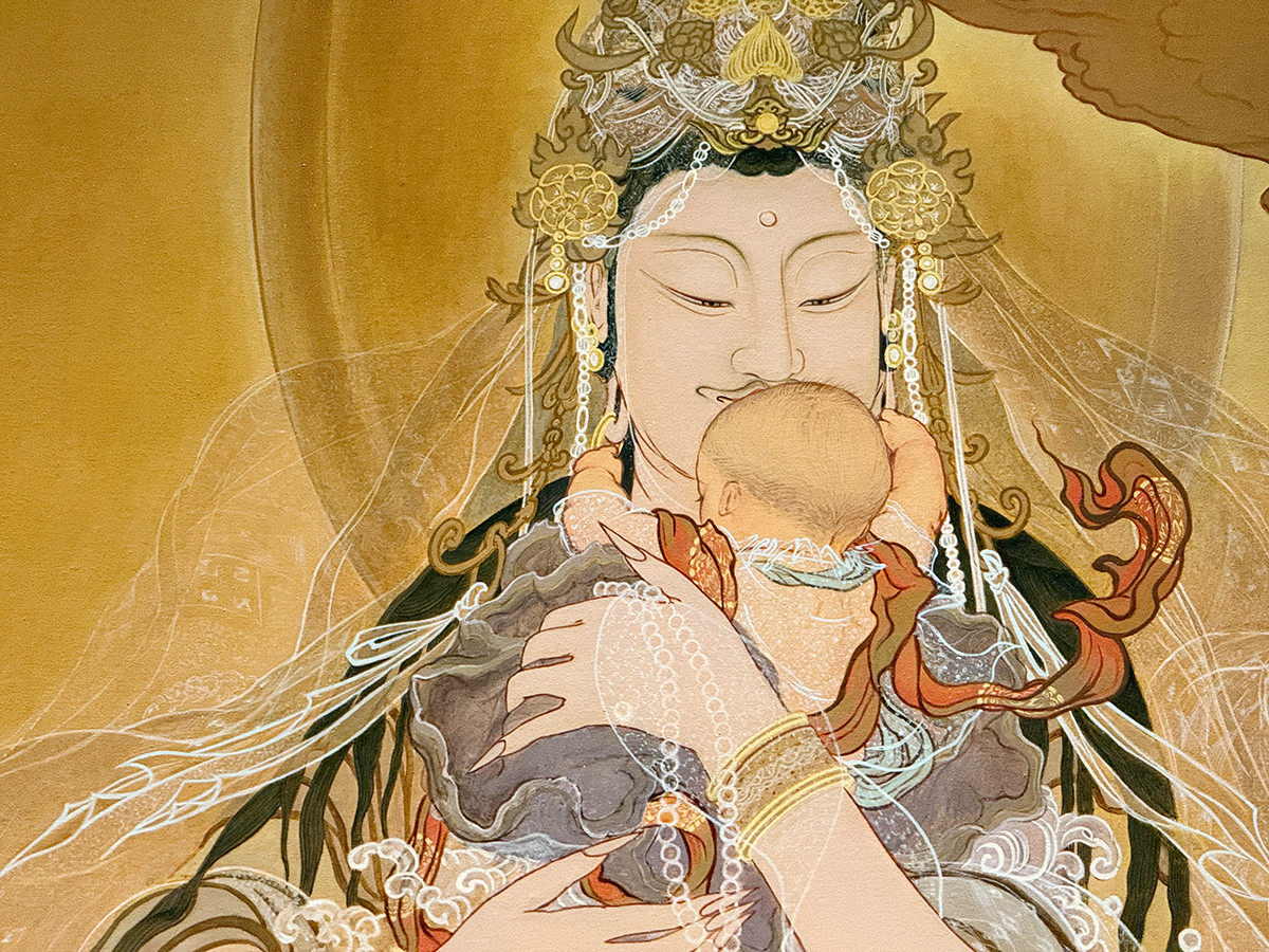 津波に飲み込まれた瓦礫の中、悲母観音は水瓶も柳の枝も手放し、赤子を抱きしめる姿で描かれます。母子の抱擁は、苦難の中にある人々を包み込むような慈愛に満ちています。