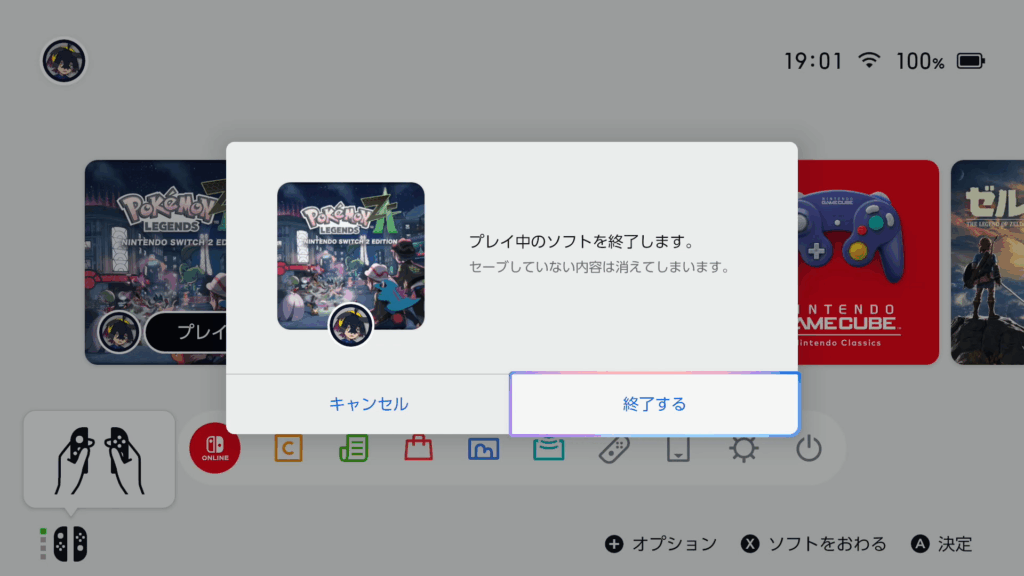 目的の個体値のポケモンが出なかった場合や、レアなボールを失うなど 何らかの不都合が起きたら、ホームボタン→Xボタンと押し、ゲームをリセットします。