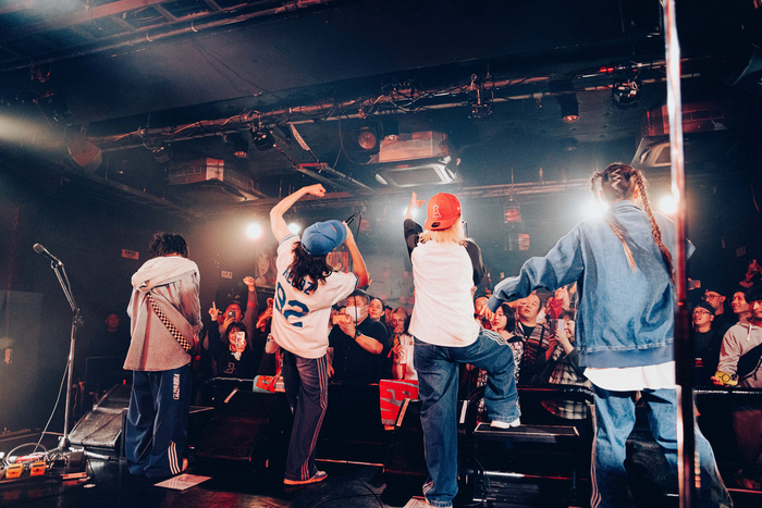 そして、ラップロックの「Runaway Baby」、メロディックパンクの「ちぇけら」と繋げ、再びフロアをかき混ぜると、来年1月10日に渋谷CYCLONEでワンマンライブを開催することを発表。観客に歓喜の声を上げさせてから、「ラスト2曲!ガチなやつ見れてないからみんなもっともっとイケますか!?」「最後までついてこれますか!?」とEmmaとMenuがそれぞれに観客に発破をかけながら、「Rollin‘」と「百ゼロ」を怒涛の勢いで繋げると、観客がこの日一番のモッシュ&ダイブ! エンディングはMenuがロングトーンで声量を見せつけ、EmmaがY字ハイキックでキメたのだった。