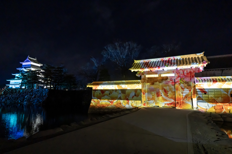 天守へのプロジェクションマッピングに加え、園路でのインタラクティブコンテンツや、城門でのプロジェクションマッピング、松本城公園のライトアップなど、松本城周辺全体が光のアートで彩られます。