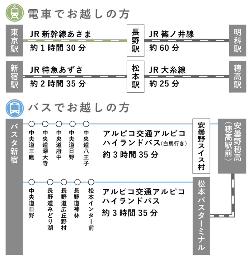 関西・名古屋からのバス利用の場合、「大阪・梅田駅」から「松本バスターミナル」までバスで約5時間50分。名古屋からは「名鉄バスターミナル」から約3時間30分で「松本バスターミナル」までのバスに乗車します。松本からは、JR大糸線に乗りかえて、約25分ほどで到着します。
