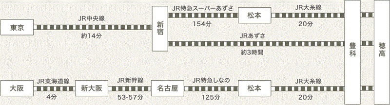 短時間で付くのはやはり電車でのアクセスです。関西などからは新幹線などで一旦、名古屋駅に向かい、名古屋からは特急「しなの」で松本駅まで約2時間。そこからJR大糸線に乗り換えて穂高まで25分です。