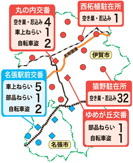 自動車関連では、伊賀署で車上ねらい(丸の内)、部品ねらい(ゆめが丘)が1件ずつ、名張署で車上ねらいが5件(名張駅前)、部品ねらいが1件(同)発生した。