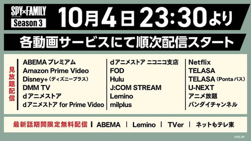 TVアニメ『SPY×FAMILY』Season 3が、10月4日(土)23:00より放送される。このたび、本作の配信情報が解禁となった。