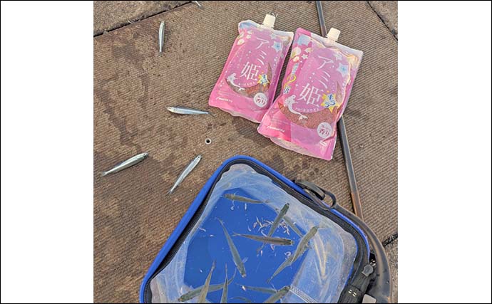 活性と潮流を見るため、持ち運びに便利なポータブルコマセ・アミ姫をパラッと撒いてみる。すると、緩やかに流れて、まだ潮が効いている感じ。