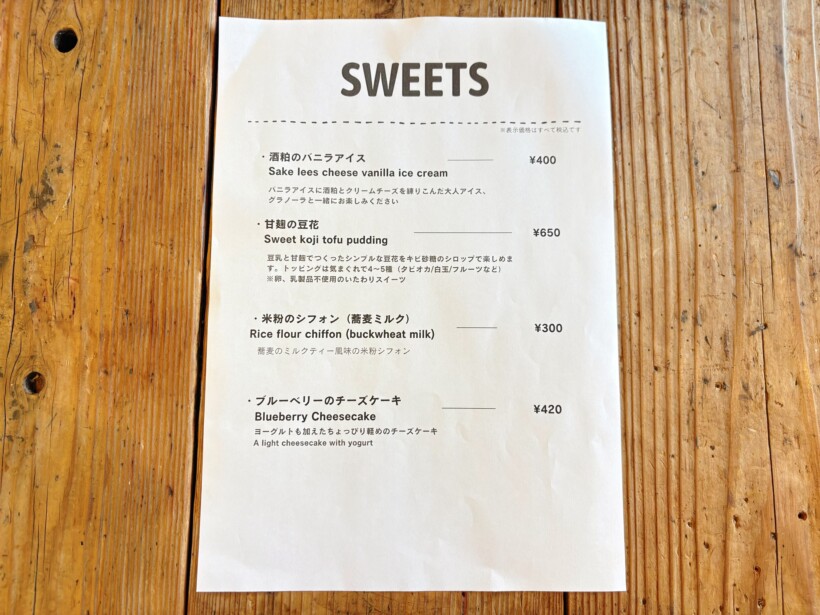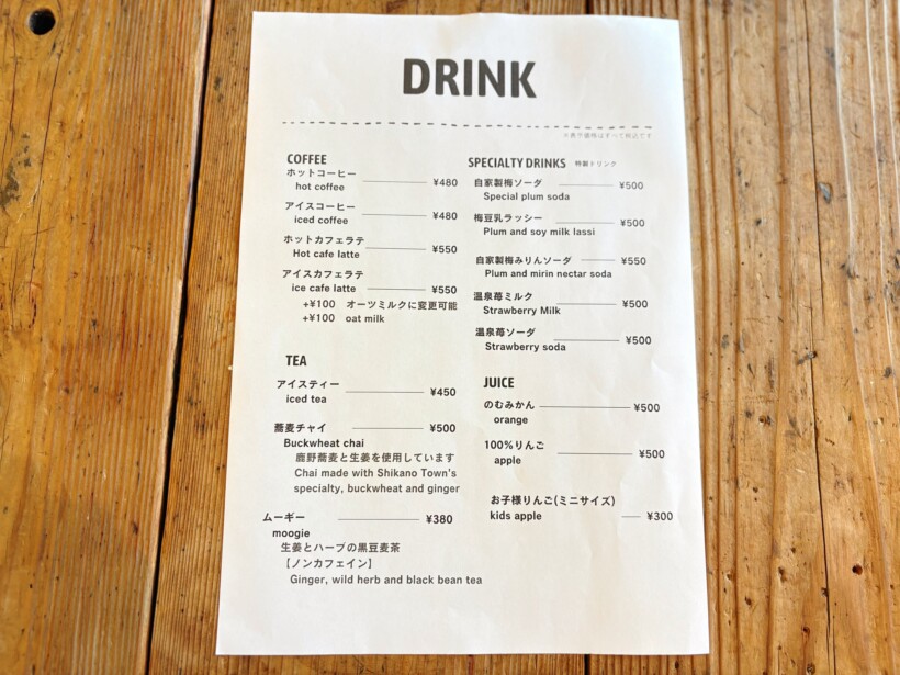 スイーツとドリンクメニューには、鹿野産の蕎麦粉を使っているものや自家製シロップで作るソーダ等鹿野でとれたものを使用されているのがわかると思います。