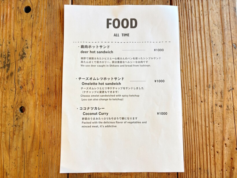 ランチのメニューは、ホットサンドやカレー、日替わりのランチセットが用意されています。鹿肉のホットサンドの鹿肉は、地元の猟師さんから直接仕入れされているそうです。