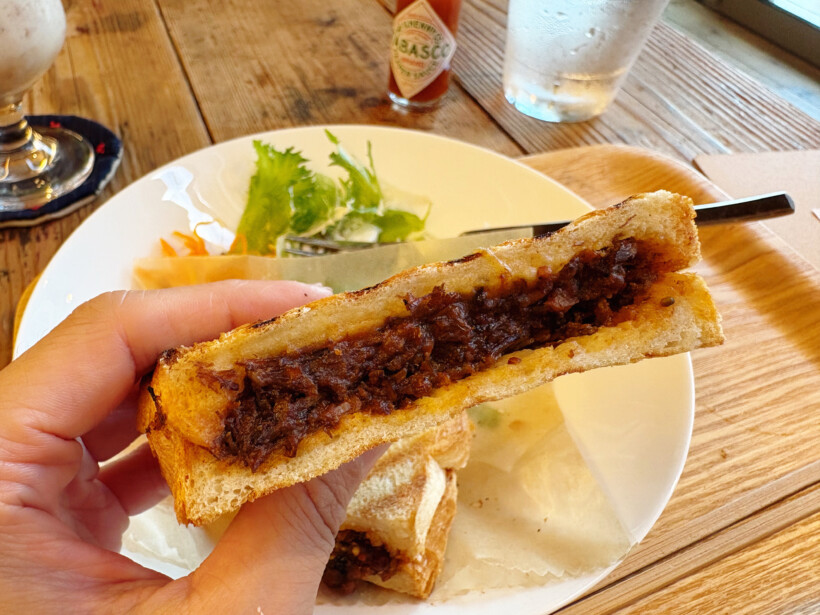 まず、最初に頂いたのは『鹿肉のホットサンド』。鹿肉は、地元猟師さんから、パンは鳥の劇場の近くにある一心庵さんの酵母パンを仕入れて使用しています。