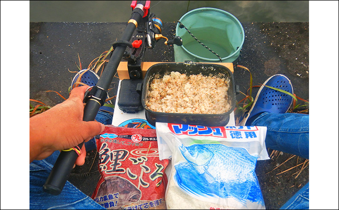 今回も前回とほぼ同じ構成で、4.5m磯竿に16lbラインをセット。メータークラスの大物が来ても問題ないタックルだ。エサは安定のマルキューマッシュポテトと鯉ごころのミックス。淡水多魚種を狙っていく。