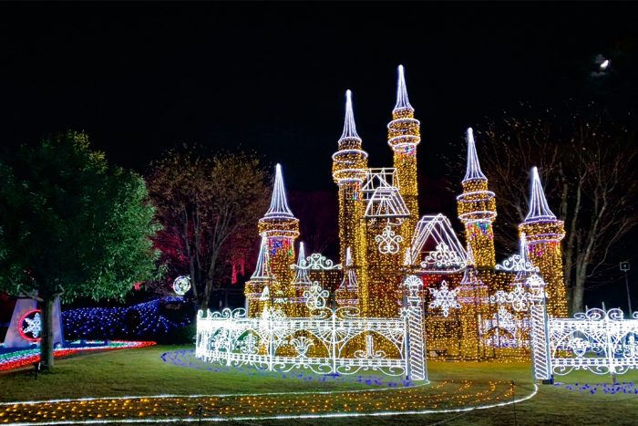 西洋の城を象った大型イルミネーションを中心に、園内を色とりどりの電飾で彩る。
