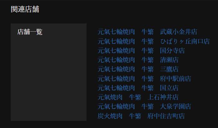 『カルビとハラミ 小金井苑』公式サイトの関連店舗欄に主に多摩地域の牛繁が載っていました。