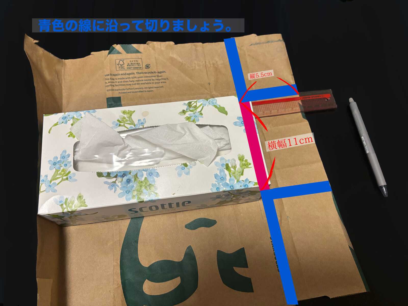 今回筆者が使用したティッシュボックスは、縦は5.5cm、横幅は11cmなので、紙の右端から5.5cm、上端からはティッシュボックスの右角垂直まで切ります。