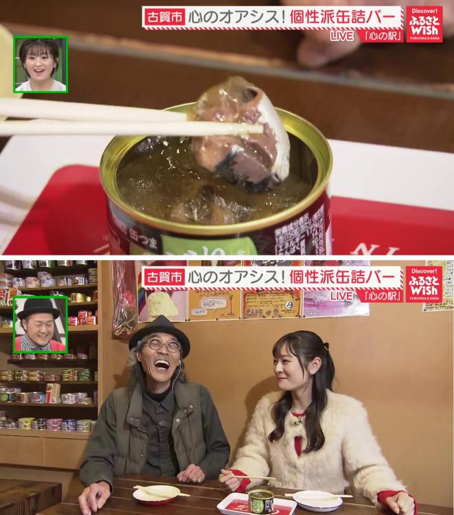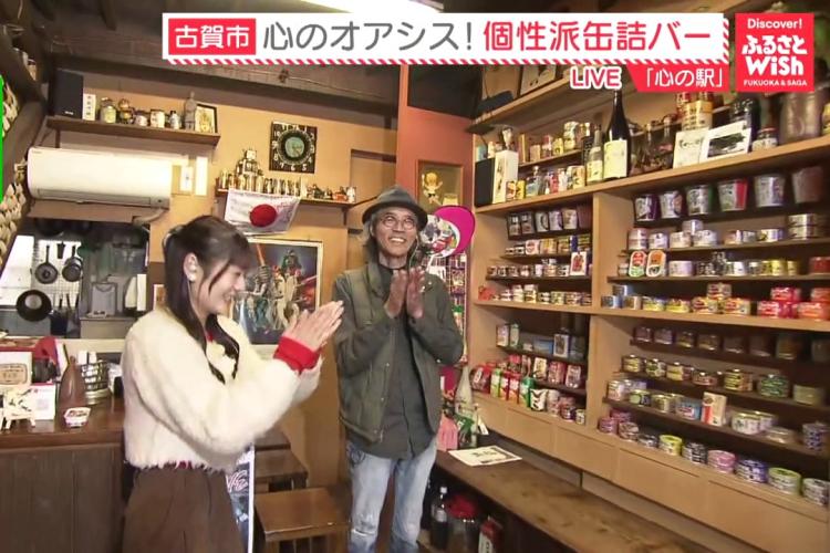 迎えてくれたのは、この道20年という駅長・福永 保さん。店内には定番から珍しいものまで、約120種類の缶詰がずらり。「昔はもっとあったけど、気合が入りすぎて疲れちゃった」と笑う駅長。店内にはライブのポスターなども貼られ、古賀の夜を愛する人々の憩いの場となっています。