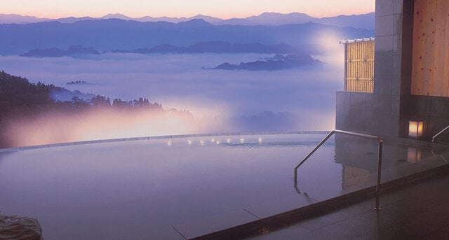 この地域ならではの絶景である雲海(うんかい)や、山あいの傾斜地に広がる“棚田”などを眺めながら温泉やお料理を楽しめる施設です。