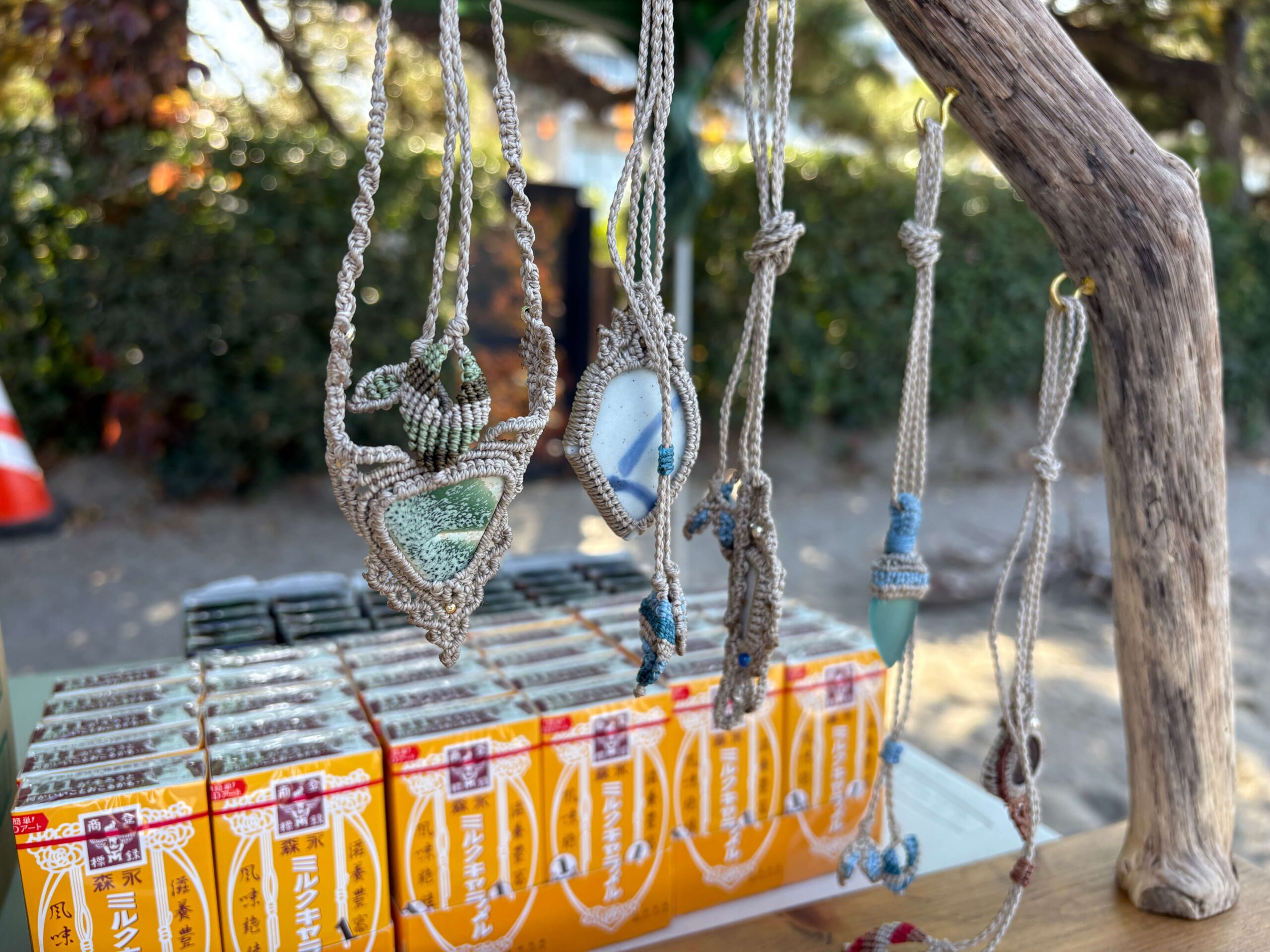 昨年のスポGOMIで回収されたシー陶器を、マクラメという特殊な編み方で編み込んだペンダントです。