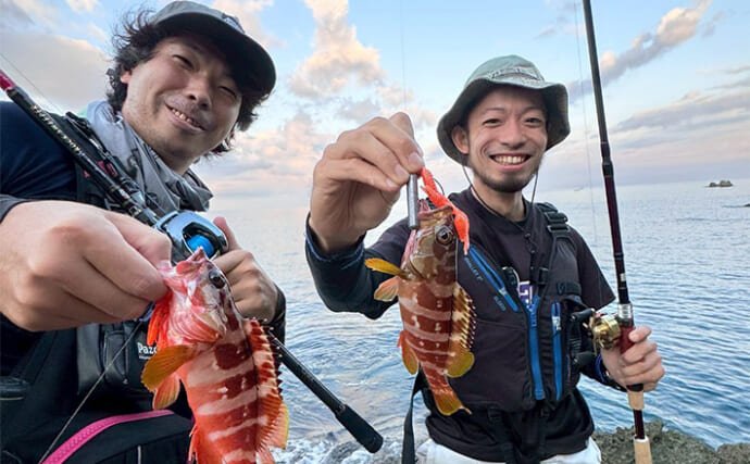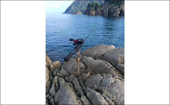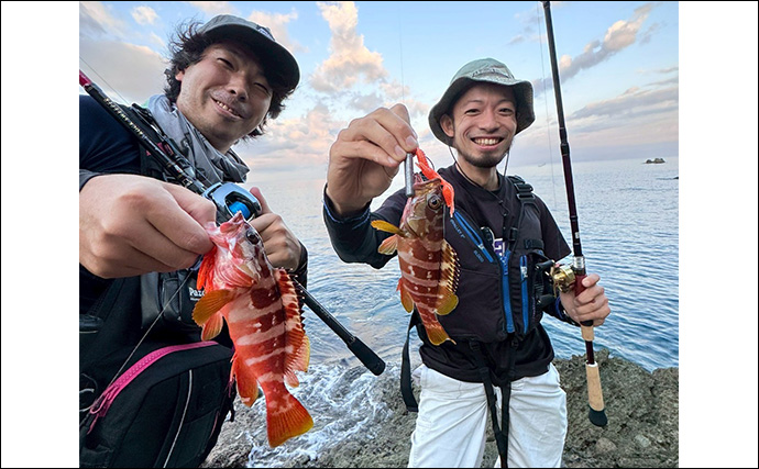 一通り把握が終わりロックフィッシュタックルとエギングタックルの準備をして先ずはメインのアカハタを狙うことにします。同じ磯に上がった赤松君はロックフィッシュ狙い、下里君はエギングと各々すでに釣りを始めているようです。