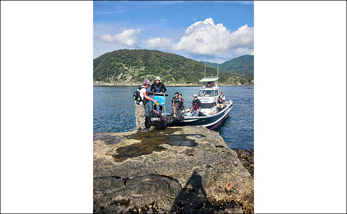 この日の釣行は11人と大所帯!そのため、数グループに別れて渡船することに。私は同行者2人と共に磯に渡ります。渡船開始は5:30。まだ薄暗いなか10分程で目的の磯に到着です。皆で協力しながら荷物の受け渡しを行います。