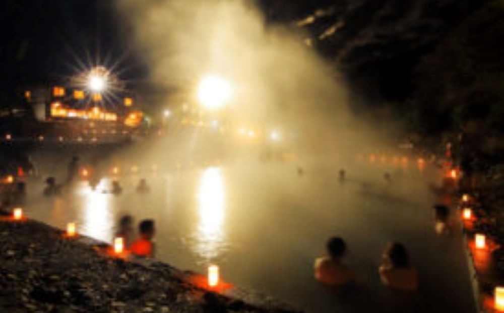 温泉から立ち上る湯気が河原を彩る灯篭に照らされ、幻想的な雰囲気に。湯船に寝そべり、満点の星空をうっとり…。毎週土曜20:00~22:00に実施(天候により中止の場合あり)。