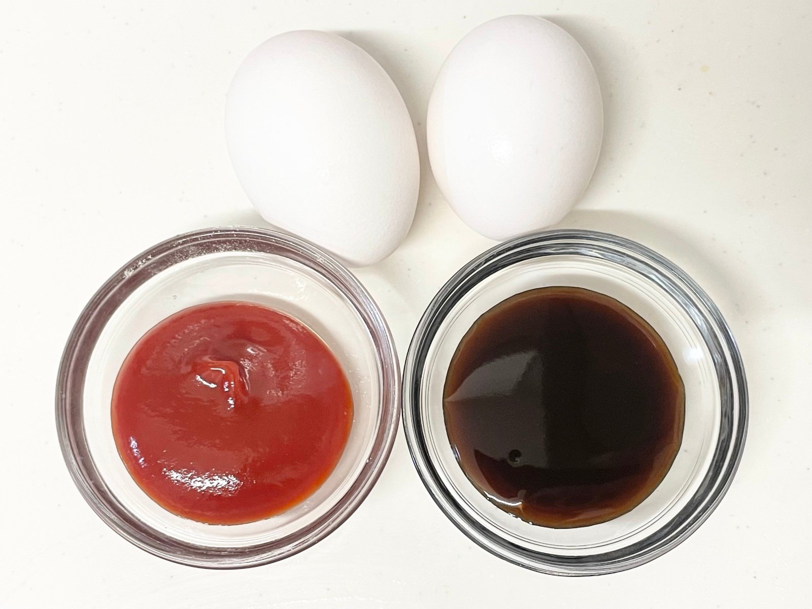 ケチャップとウスターソースのコクが合わさった、簡単デミグラス風味の味玉です。