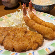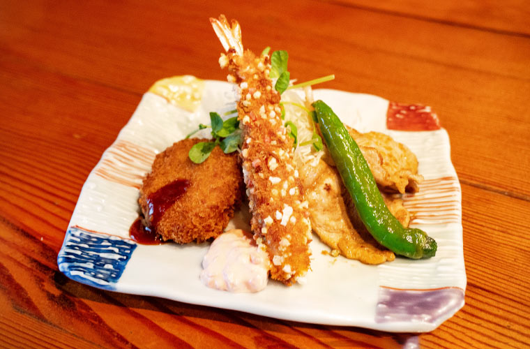 ボリューム満点の前菜プレートに加え、しょうが焼きやエビフライなどのメインも楽しめます。エビフライは、あられを混ぜた衣が特徴。サクサクとした軽やかな食感が印象的で、食べ応えも抜群です。