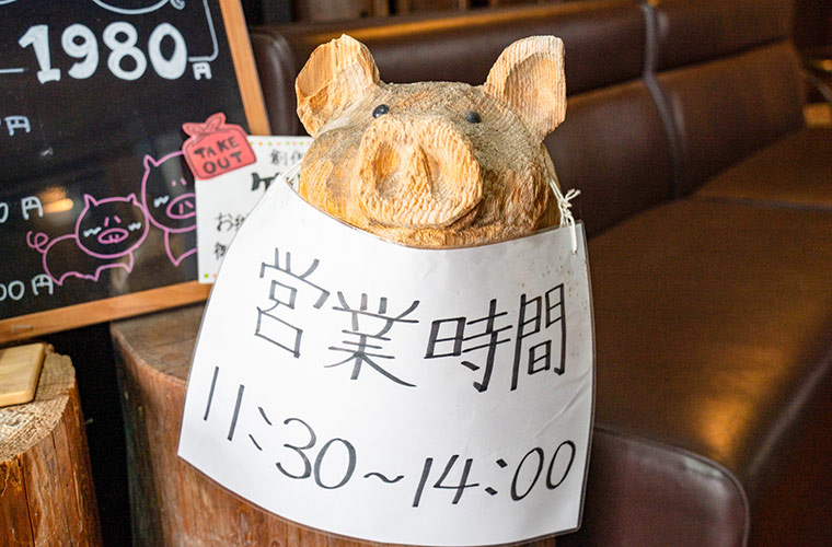 店内に入ると、混雑時に利用可能な待合スペースがあり、入口近くではかわいらしい豚の置物がお出迎え。思わず頭をなでたくなるような愛嬌があります。