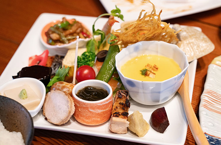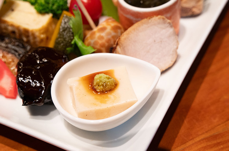 10種類ほどの前菜が並び、見た目にも華やかなプレートは、思わずテンションが上がります。一品一品がすべて手作りで、手間暇を惜しまず丁寧に仕上げられた味わい。取材時はポテトサラダやもずく酢、だし巻き卵など。見ているだけでワクワクするラインナップです。
