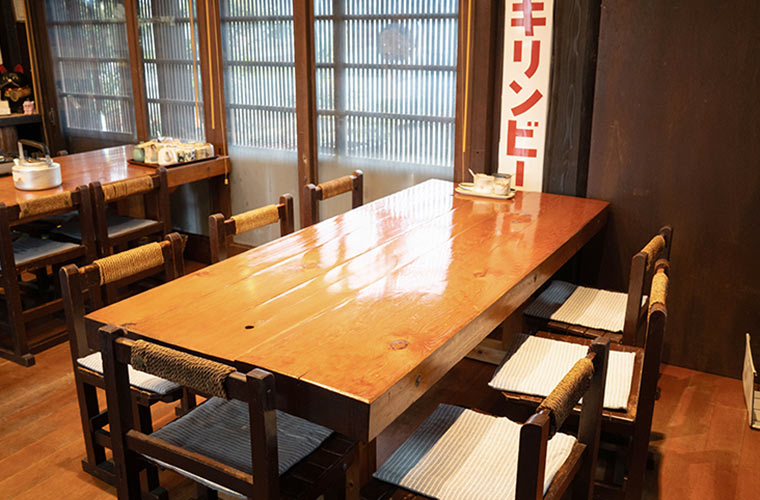店内のテーブルやついたては、元大工というオーナーのお父さんによる手作り。長年培ってきた確かな技が光る家具の数々は、素朴ながらも職人のぬくもりが感じられ、使い手に配慮した見事なしつらえです。屋根や店先の看板までも手がけたというから驚きです。