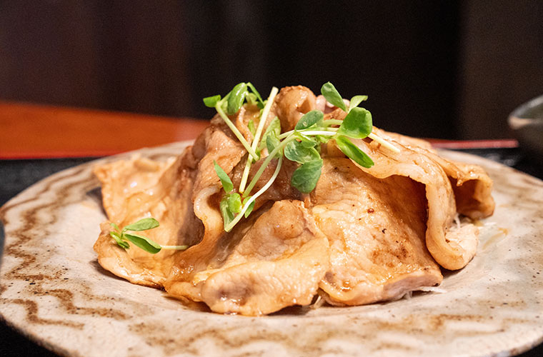 前菜の内容は季節ごとに変わり、訪れるたびに旬野菜を生かした、さまざまな創作料理でもてなしてくれるのが魅力。取材時の「ごま豆腐」は、季節感こそないものの、香ばしいごまの風味がしっかりと感じられ、同料理にかける熱い思いがひしひしと伝わってくる一品。ワサビ醤油をかけていただくと濃厚なごま豆腐が驚くほどサッパリとした後味に。とろりとした食感にも魅せられること間違いなし。