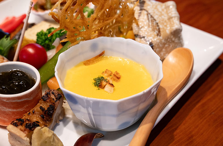 添えられた季節のスープも注目の一品。取材時のコーンスープは、濃厚でコク深く、前菜全体をまとめてくれる存在です。