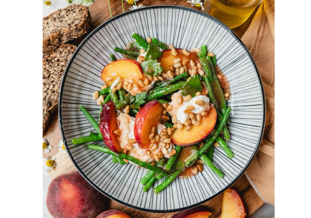 「エブリィ・サマー・サラダ」旬のモモとヤギのブッラータが主役。インゲンの歯触りと松の実のコク、コリアンダーが夏らしい清涼感を添えるサラダ。photograph by Alice Pagès