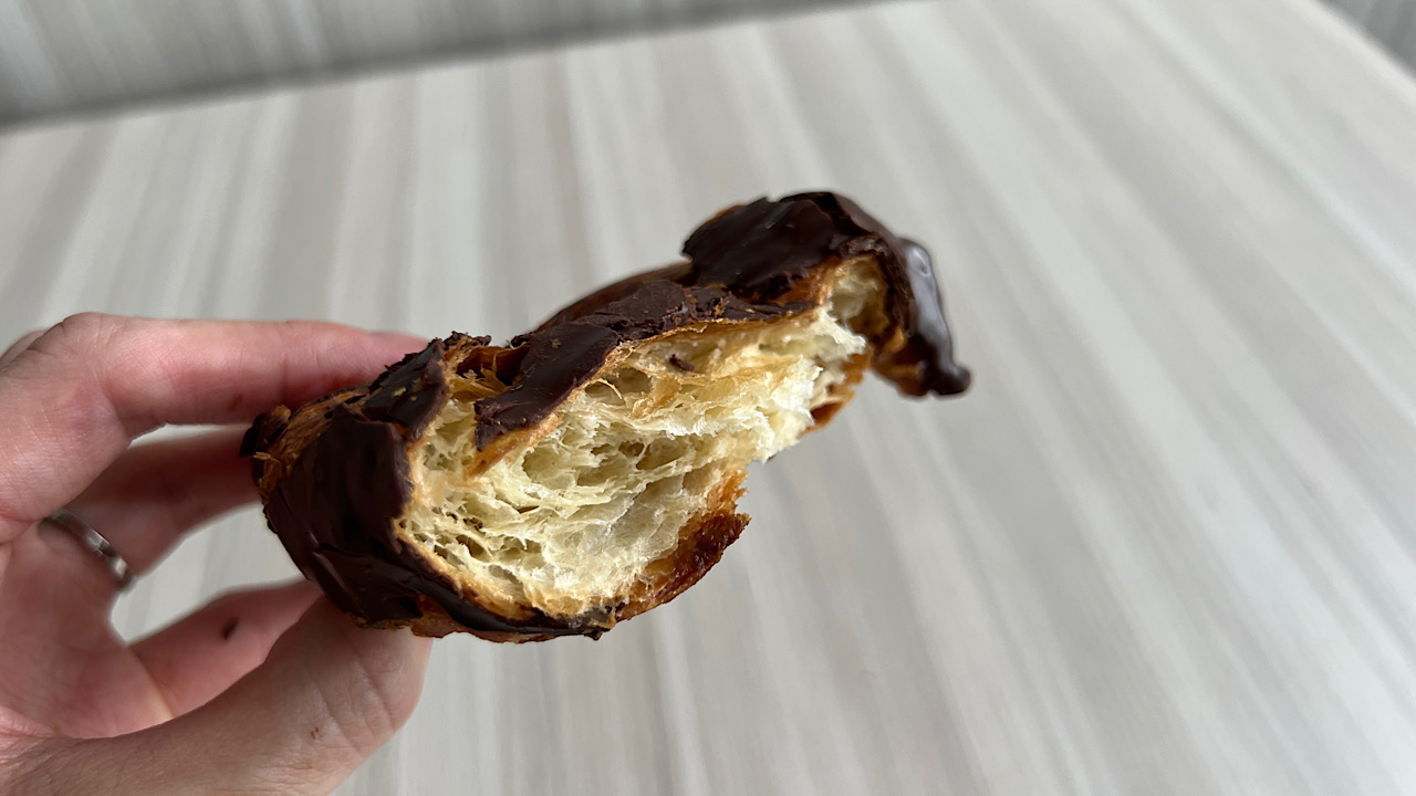 チョコレートがメインなだけあって、ガーナ産を中心にさまざまなカカオをブレンドした高級チョコが、その味を引き立てるよう作られたクロワッサンにたっぷりとかかっています。