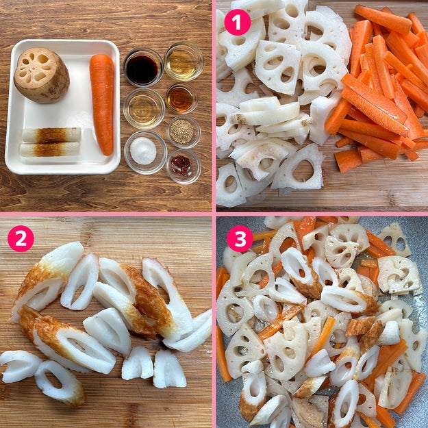 ① れんこんは皮むいて薄いいちょう切り、にんじんは皮をむいて細切りにする。